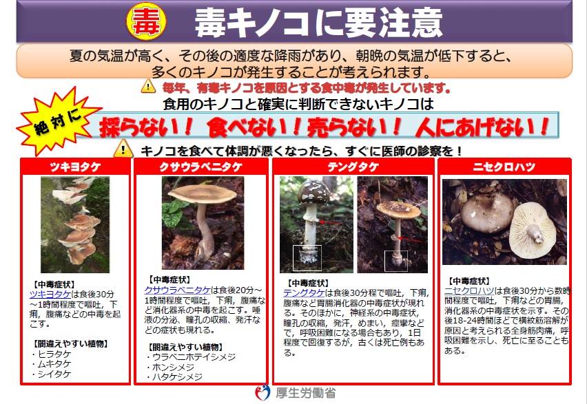 今年も毒キノコを食用と誤って採って食べたことによる食中毒が発生し、亡くなられた方もいます。