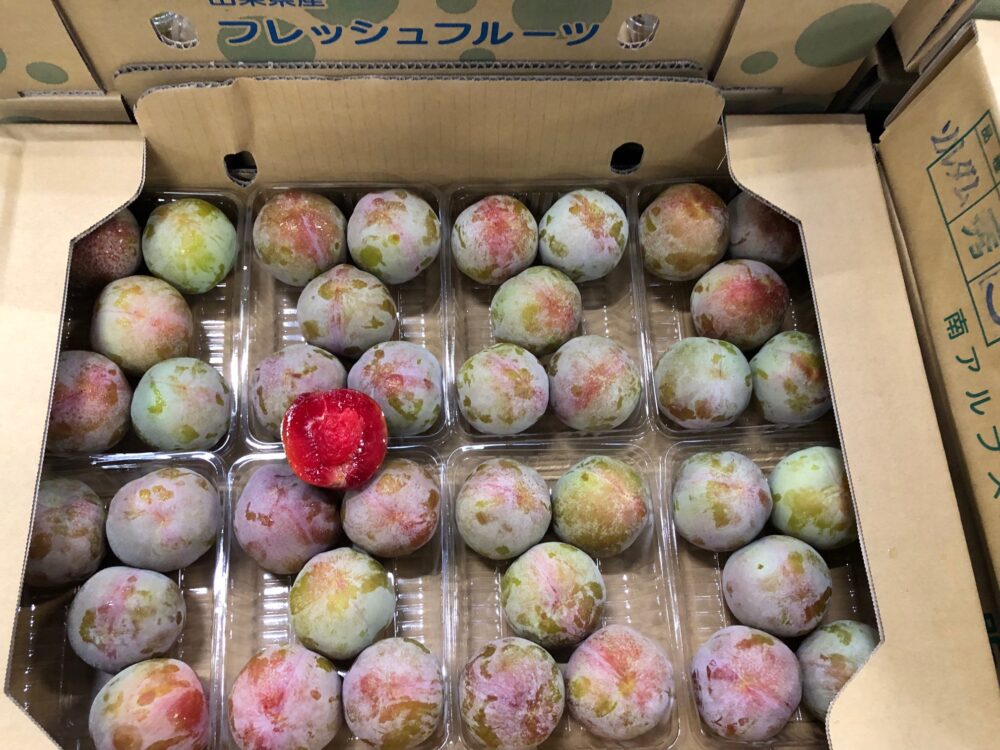 すもも品種別栽培面積第2位の「ソルダム」。見かけはくすんだ緑色で地味な感じですが、果肉はピンク色で熟すと鮮やかな紅赤色になります。