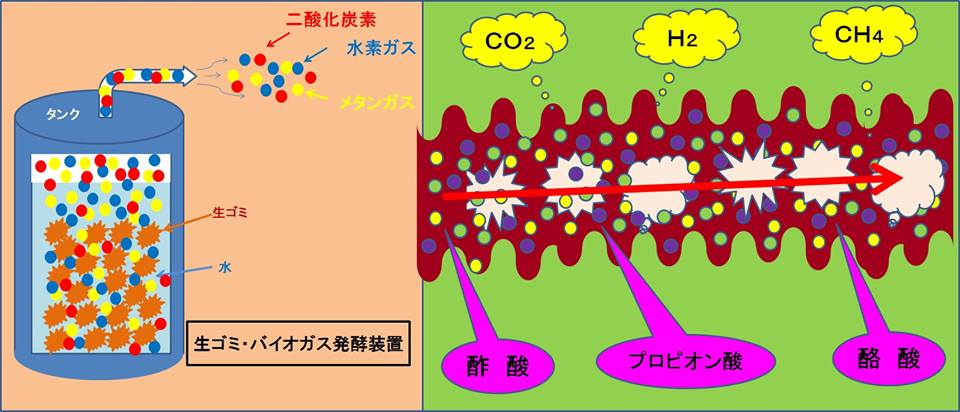 だから、生ゴミや動物の糞をタンクに詰めて置いておくと、やがて二酸化炭素、水素、メタンなどのガスが発生します。