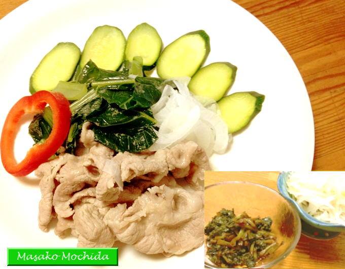 写真は「ガーリックスパイスで茹でた薩摩もち豚のしゃぶしゃぶと、小松菜、ズッキーニのバルサミコ炒め、葉ワサビの佃煮♪」です。葉ワサビの佃煮はご飯がすすみます。