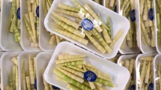 青森でタケノコといえばやっぱりネマガリダケ。山で採取される山菜です。画像は「むきタケノコ」。1本ずつ手できれいに皮を剥くのはもはや職人技。甘くて柔らかく味噌汁や煮物にすると絶品です。