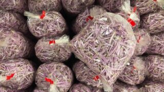 青森では「もってのほか」と呼ばれる淡い紅紫色の食用菊「延命楽」。「紅もって」「もって菊」「かきのもと」など地域によって呼び名は異なります。花びらが筒状になっているため、加熱後もシャキシャキ、クキクキした歯ごたえの良さを楽しめます。