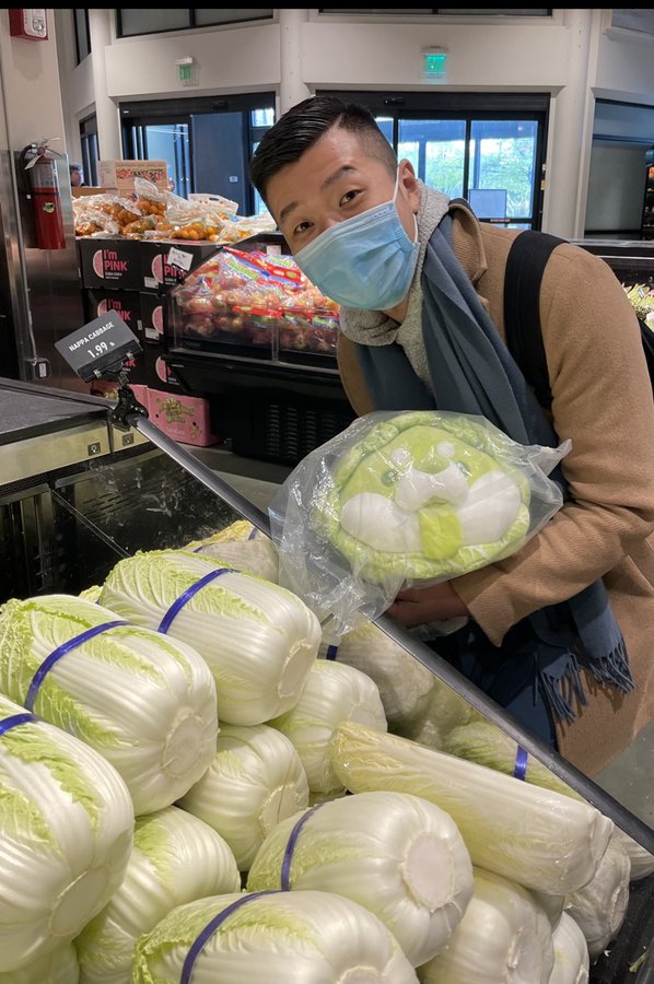 シアトルにある日本のスーパー宇和島屋 ( Uwajimaya )の白菜コーナーで、白菜犬のぬいぐるみがいっしょに売られていました。