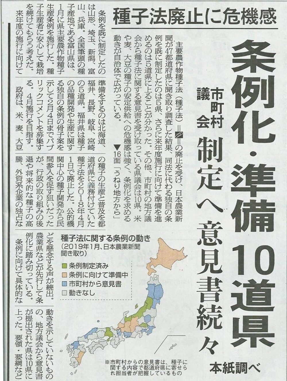 種子法廃止の暴挙を許すな スポンサードリンク タネのいろいろ X Facebook はてブ LINE Pinterest コピー 2019.01.262024.05.27 種子法廃止の暴挙を許すな ~種子法廃止ののち5県が独自の条例を制定~ 内田聖子/Shoko Uchida さんからRT 種子法廃止の後、5県が独自の条例を制定、また5道県が条例を準備中。 さらに地方議会からの2017年1月~2019年1月22日までに提出された「種子」関連意見書は衆院で126、参院で142件。 その要望内容は種子法復活や新法制定など。
