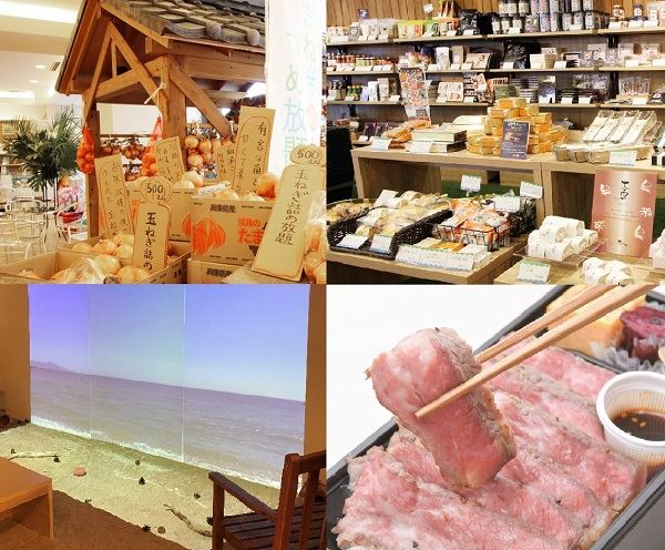 淡路牛や海鮮、野菜をふんだんに使った日替わりのお弁当は、早めに購入しないと売り切れてしまうことも。洲本の品の購入だけでなく、フォトスポットの玉ねぎ小屋や美しい海を再現したビーチなど体験型のアンテナショップとなっています。