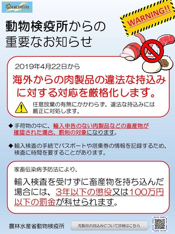 ご旅行の際は、肉製品を日本に持ち帰らないようお願いします。
