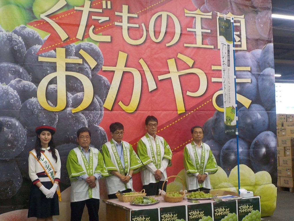 本日、本場では岡山県産のマスカット・オブ・アレキサンドリアの初売りセレモニー。