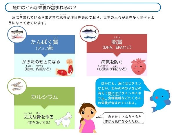 例えば「水産業」のページでは、「魚にはどんな栄養が含まれるの?」という身近なことから、「世界ではどのくらいの魚が食べられているのだろう?」といった幅広い話題まで学ぶことができます。