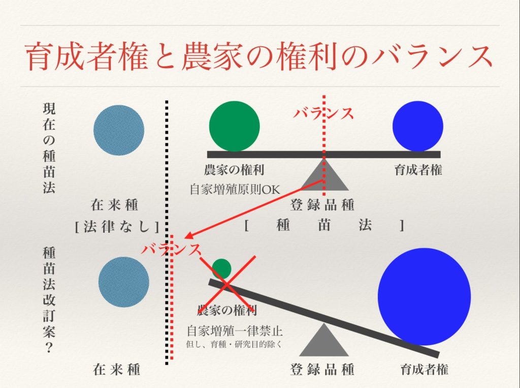 これまで #種苗法 では種子育成者の権利と種子を使う農家の権利はバランスされてきた。でも今回の改定でバランスは失われる。