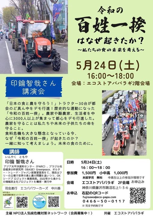 本当にこのままでは日本の食は大変なことになってしまう、ということで、5月24日、藤沢で何が問題で、どうしていくべきかを考える学習会を行います。