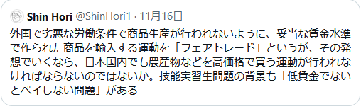 国内の農家にもフェアトレードを スポンサードリンク トピックス X Facebook はてブ LINE Pinterest コピー 2021.11.17 国内の農家にもフェアトレードを 有機農業ニュースクリップさんからRT 昨年亡くなった有機農家は、どう計算しても時給300円だと、そのひどさに、10年以上前から、「国内の農家にもフェアトレードを」と言ってきた。 農家の労働に見合う対価は安すぎる。 しかし、消費者の収入が増えることなく改善されることはあり得ない。 特にこのところの格差拡大で所得低下の状況では・・・