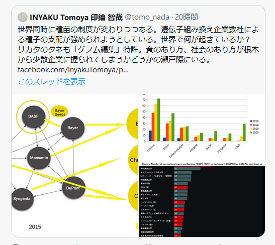 今年はフィリピンで遺伝子組み換え稲、ゴールデンライスの大規模栽培が始まると言われ、アルゼンチンの遺伝子組み換え小麦も昨年拡大した。さらに英国や日本では「ゲノム編集」小麦の栽培実験。
