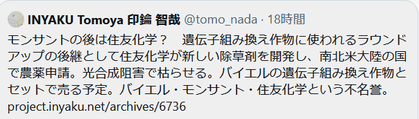 自然は独占できない スポンサードリンク トピックス X Facebook はてブ LINE Pinterest コピー 2022.05.15 目次 自然は独占できない 自然は独占できない INYAKU Tomoya 印鑰 智哉@tomo_nadaさんから 住友化学の中で急成長な農業資材部門がある。 根圏微生物資材などを用いた「バイオラショナル」部門。 自然な微生物との共生こそが基本で化学物質ではそれは代替できないと方向転換するなら歓迎。 ただ、住友化学が微生物に遺伝子操作しないか心配ではある。 自然は独占できないから。 独占企業は不要