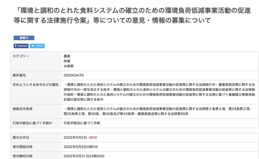 みどりの食料システム戦略の施行省令に関するパブコメ締め切り迫る(5月31日)。