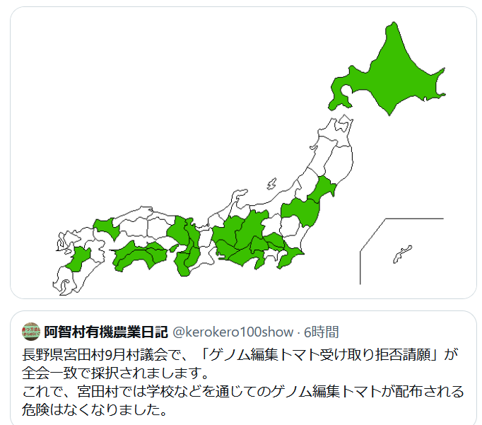 「ゲノム編集」トマト苗の受取拒否の地方自治体が増加中 スポンサードリンク ゲノム編集 X Facebook はてブ LINE Pinterest コピー 2022.10.092024.10.09 「ゲノム編集」トマト苗の受取拒否の地方自治体が増加中 INYAKU Tomoya 印鑰 智哉さんから 宮田村すばらしい! 現在、「ゲノム編集」トマト苗の受け取りを拒否する地方自治体が増えていて、その数少なくとも148。 長野県では宮田村の他、少なくとも2自治体が拒否(確認中)。 ぜひ、この動きを全国で。集約中。 詳細はこちら
