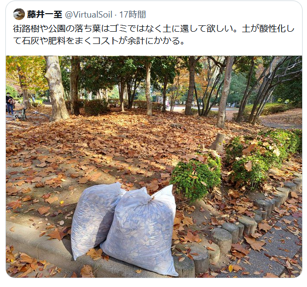 落ち葉はゴミではない スポンサードリンク トピックス X Facebook はてブ LINE Pinterest コピー 2022.11.132023.12.02 落ち葉はゴミではない 枯れ枝さんから 私自身、公園管理の仕事もしますが、公園の地面は草が地際まで刈られ、土が踏み固められている事が殆どなので、落ち葉が地面れず、何だに保持さかなあと思います。 世間では「草がない、落ち葉がない」=「綺麗」という価値観が蔓延っているので、価値観を変える必要があるのかなと常々思っています。