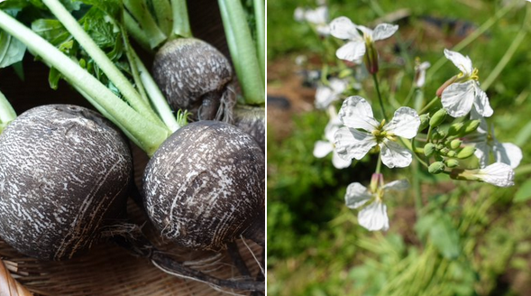 種は、昨年に地域の農家から購入した黒大根のヘタを土に植えて、春に花を咲かせてゲットしました。
