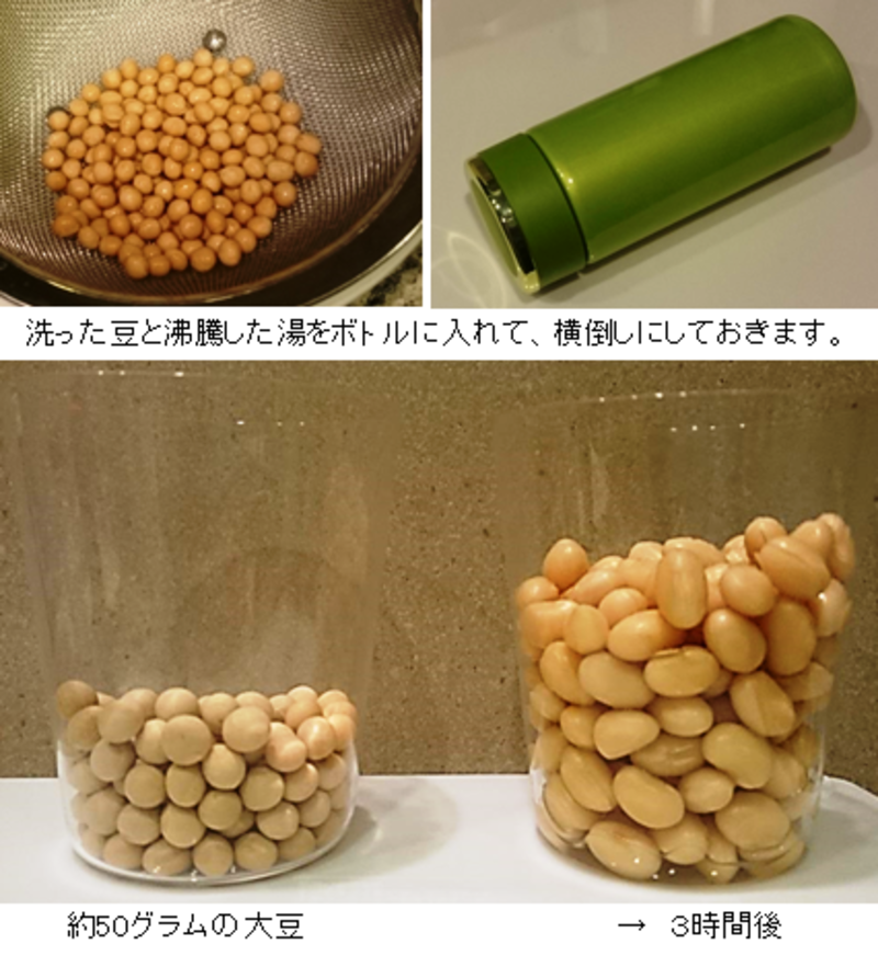 この方法でゆでられる乾燥豆の量は、容量500mlのステンレスボトルで50gくらい。豆の量が多いとお湯の温度が下がってしまうのでご注意を。