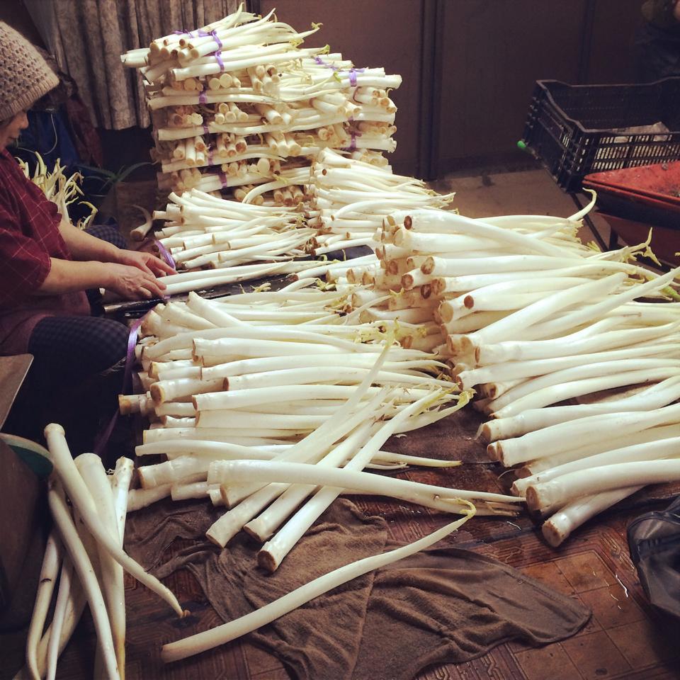 日に当たらないように、もみ殻などの中に深く埋めて軟白栽培して収穫されます。