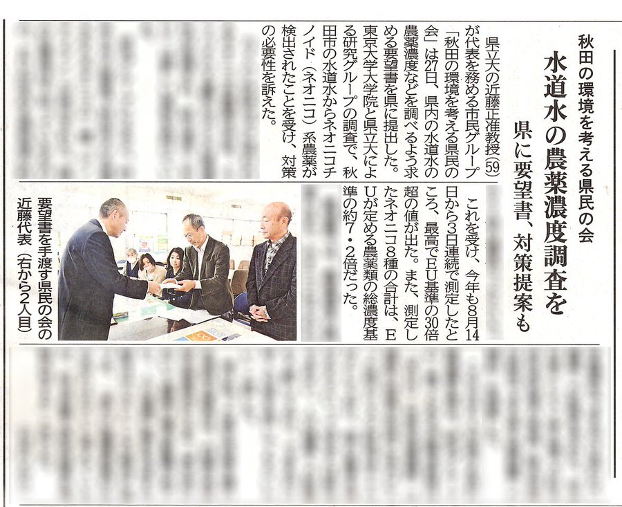 秋田市の水道水から高濃度のネオニコが検出された問題で、秋田県立大と東京大学の研究グループが今年8月の3日間連続で調査したところ、EUの基準値の30倍(3000ng/L)を超え、ネオニコ8種の合計はEUの総濃度基準の7.2倍だった。