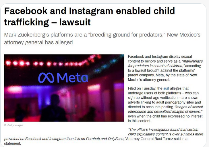 メタとインスタも危なくなってきた スポンサードリンク トピックス X Facebook はてブ LINE Pinterest コピー 2023.12.08 目次 メタとインスタも危なくなってきた メタとインスタも危なくなってきた 島倉大輔さんから Facebook と Instagram が児童の人身売買を可能にした – 訴訟 マーク・ザッカーバーグのプラットフォームは「捕食者の温床」であるとニューメキシコ州司法長官が主張