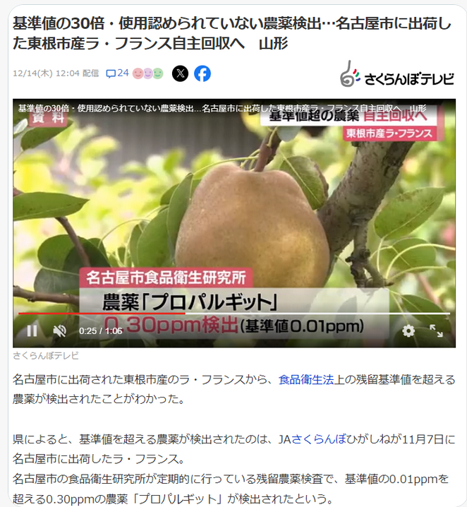 使用が認めらていない農薬が検出…JAさくらんぼひがしね
