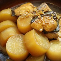This is a dish called “Buri Daikon” (simmered yellowtail and daikon radish).