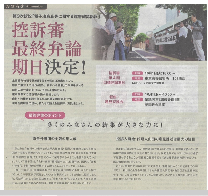 種子法の違憲裁判の最終弁論での私の意見陳述書。