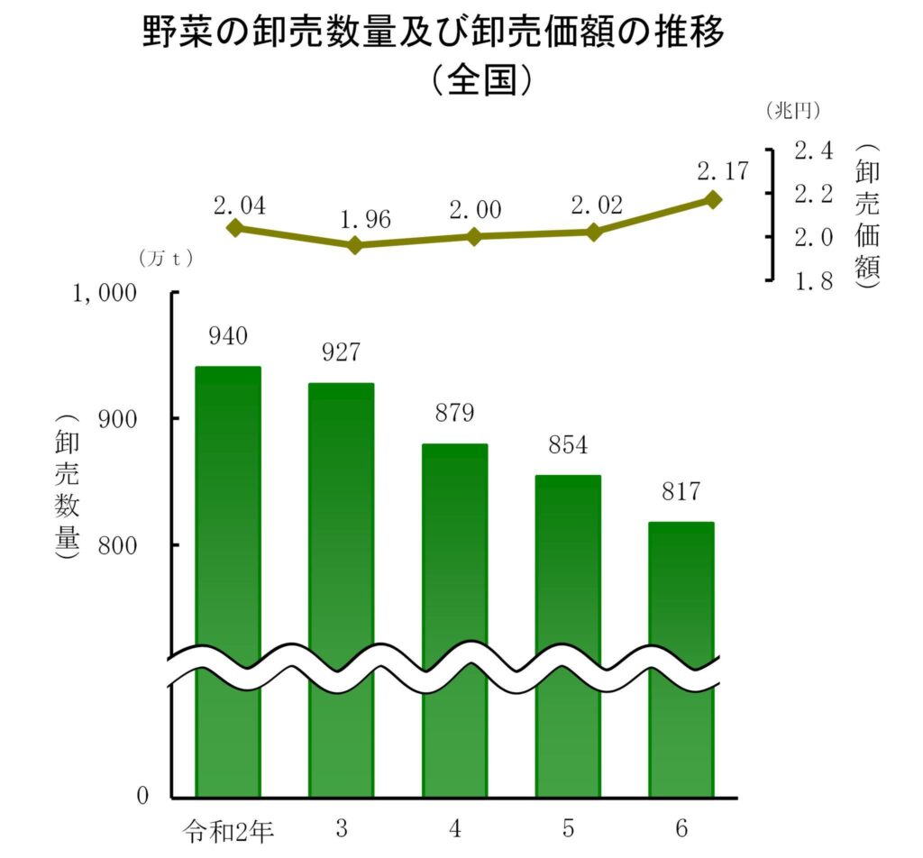野菜の卸売数量は817万tで、前年に比べ4%減少しました。