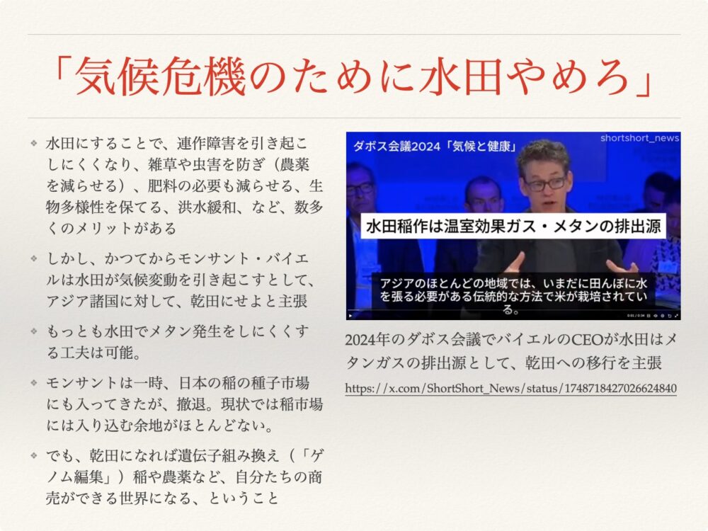 モンサントを買収したバイエルのCEOは2024年のダボス会議で、アジアの水田こそ、温暖化効果ガスのメタン排出源であり、乾田に変えるべきだ、と発言した。そしてその発言は日本では冷ややかに受け止められただろう。