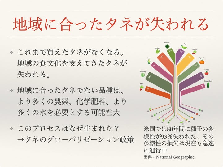同時に1990年代から進んだ種苗政策の極端な育成者権(知財権)偏重と種苗のグローバリゼーション政策(タネを海外生産に任せる)も、日本の農業の健全な発達を損なう根本原因の一つとして注目する必要があります。