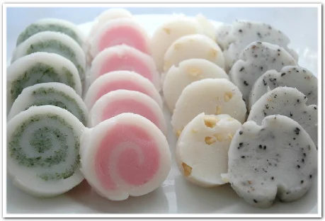 作り方は、米粉に砂糖と塩を入れてよく混ぜ、熱湯を入れてよくこねます。生地をこぶし大の大きさに分け、箸をさしてもつかない程度まで蒸し器で蒸したら、黒ごまや茹でておいた青豆などを入れて、さらにこねます。直径5cm位の棒状にのばしたら出来上がり。
