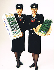 トラック輸送からJALカーゴ利用で「空飛ぶ野菜」となりました。JALのスチューワデスに博多万能ねぎを持ってもらった写真は鮮度と信頼感をアピールしたものです。