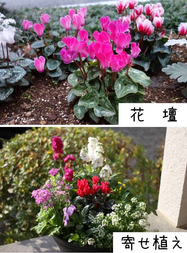 葉ボタンやパンジーといった冬の花壇の定番に並んで、よく見られるようになったガーデンシクラメン。