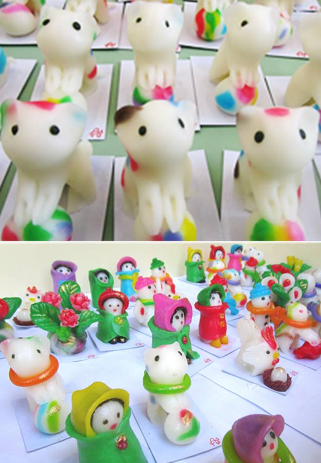 「チンコロ」とは、しんこ(米粉)を使い、犬や猫、十二支の動物などをモチーフにして形作られる、大きさが3cm位の人形細工のこと。すべて手づくりのため、ひとつひとつ形や表情、色使いが異なります。