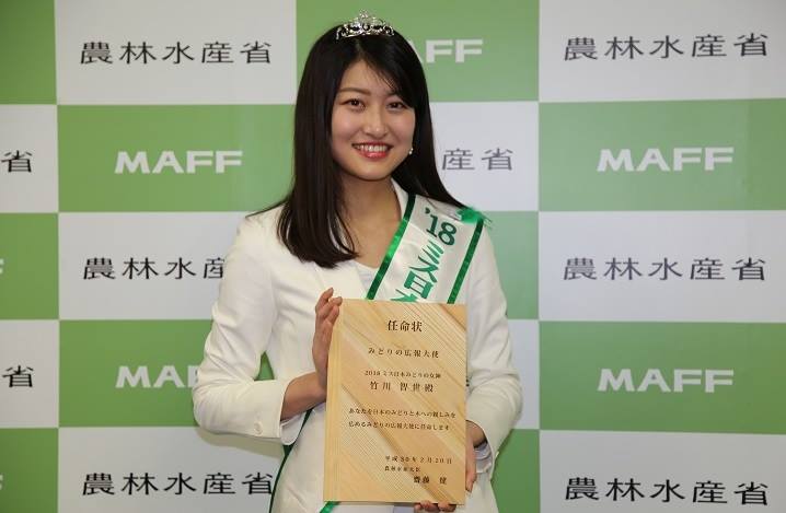 農林水産省は、「2018 ミス日本みどりの女神」に選ばれた竹川 智世(たけかわ ちせ)さんを「みどりの広報大使」に任命しました。
