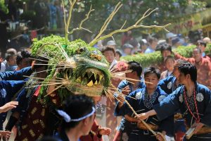 このお祭りでは、竹にワラを巻き付けて作った長さ15mもの大きな体に、シダで飾った怖そうな龍の顔の蛇(ジャ)が、全部で7体、間々田八幡宮に集まってお祓いを受けた後、境内の池の水をたらふく飲んで町へ繰り出します。