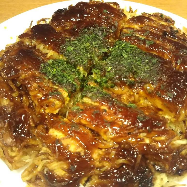 「広島風お好み焼き」や大阪の「モダン焼き」と同様に麺を使っていますが、先の二つが生地や具の間に麺を入れるのに対し、府中焼きでは生地の上にのせます。