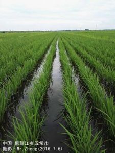 北部の黒龍江省の田んぼでは、7月上旬、分げつ期を迎えた一期作の稲が順調に生長していました(写真)。