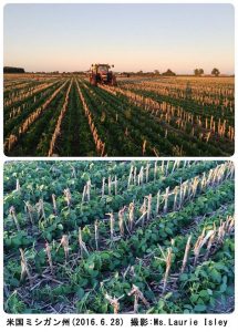 前作物のとうもろこし収穫後、すき込みを行わず、大豆を播種したもので、このような栽培方法を不耕起栽培といいます。北米や南米諸国で大規模に導入されています。