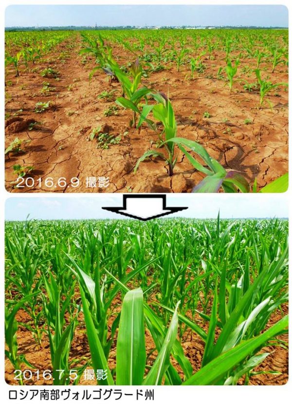 写真はロシア南部ヴォルゴグラード州のとうもろこし畑です。約1ヶ月でとても大きく生長していますね。今のところ、病害も虫害も見られず、順調に生育しているとのことです。