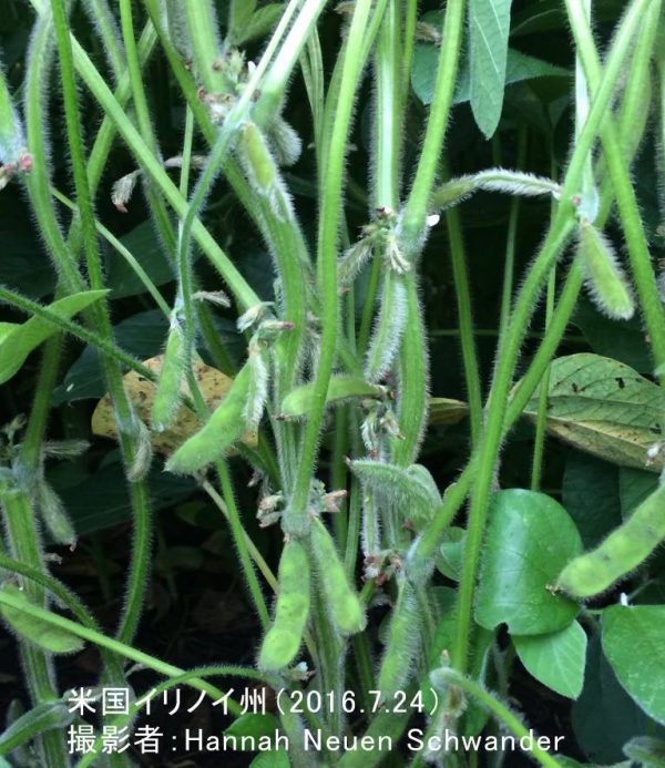 写真は、2016年7月24日現在、イリノイ州北部の着莢期を迎えた大豆の様子です。