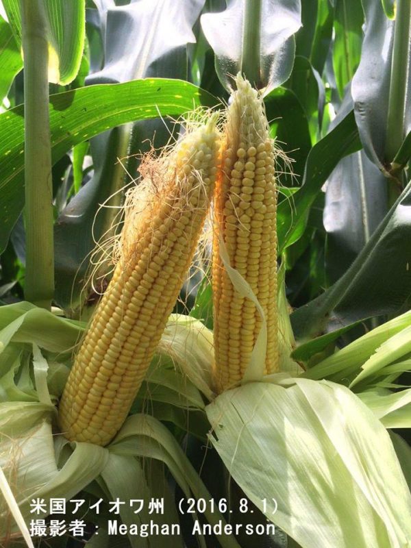 写真は、アイオワ州のデント期のとうもろこしです。デント期とは、とうもろこしの粒が固まり、歯(デント)のように硬くなる時期です。今後の生育には乾燥した天候が望まれます。