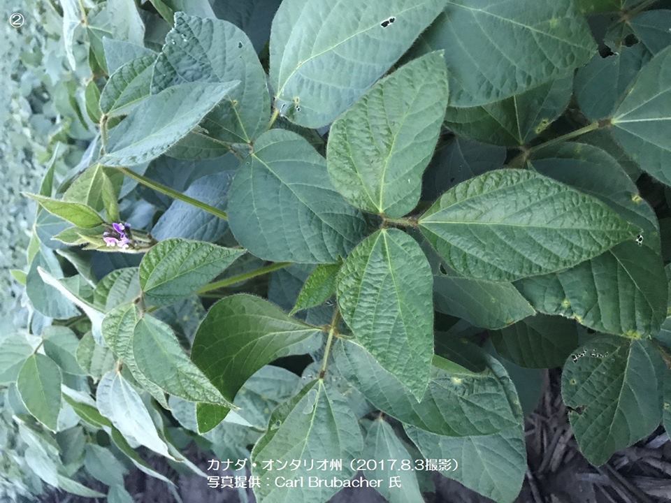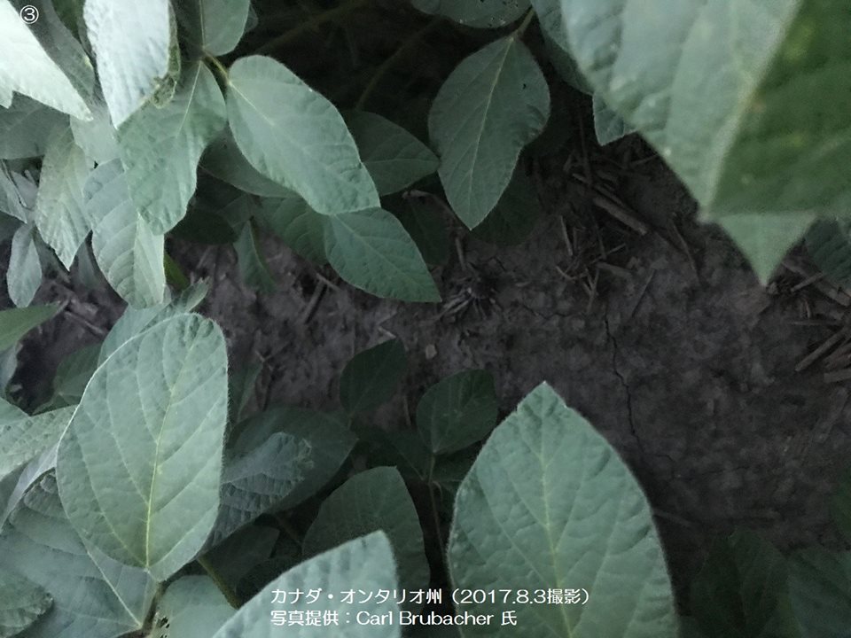 3枚の写真は、オンタリオ州のカールさんの8月3日時点の大豆畑です。