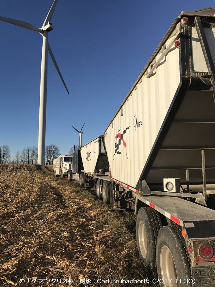 写真は、収穫された大豆を運ぶトラックです。