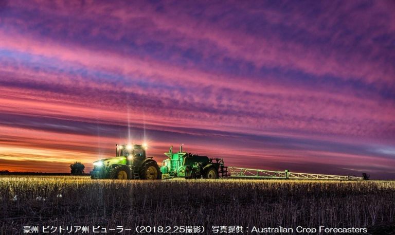 本日の写真は、豪州南東部ビクトリア州の収穫後の圃場で、来期の播種に向けて、害虫や雑草を駆除するため、殺虫剤・除草剤を散布している様子です。