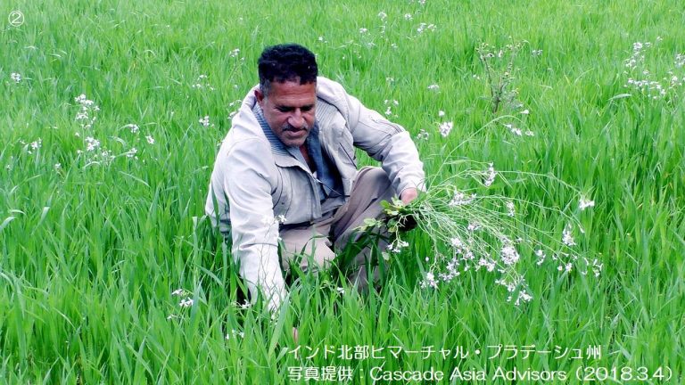 The crop was in tillering/flowering stage. Photo① shows the healthy wheat field with good amount of rain in February end. This rain supported not only wheat development but also growing abundant quantity of weed, named Muraha (local weed name).