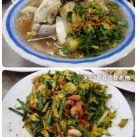印象に残ったものは、キャットフィッシュ(ナマズ)の酢煮込み(写真上)とメコンの花の炒め物(写真下)です。