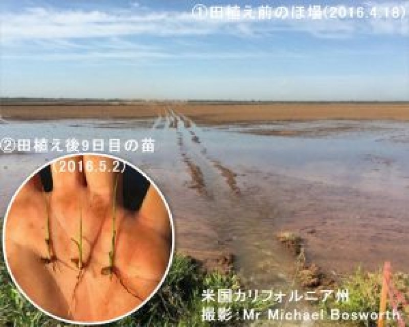 4月半ば、米国カリフォルニア州では田植え前のほ場に水を張り始めました(写真大)。