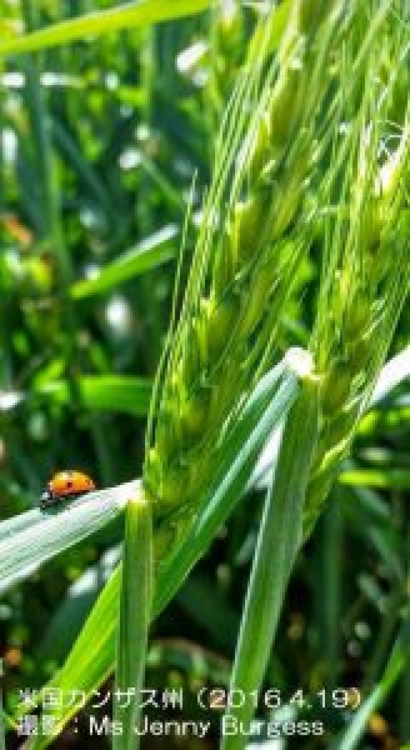 4月半ば、米国カンザス州の乳熟期を迎えた小麦の穂に、てんとう虫がやってきました。これは害虫であるアブラムシを食べてくれる種類で、とても有難い存在です。